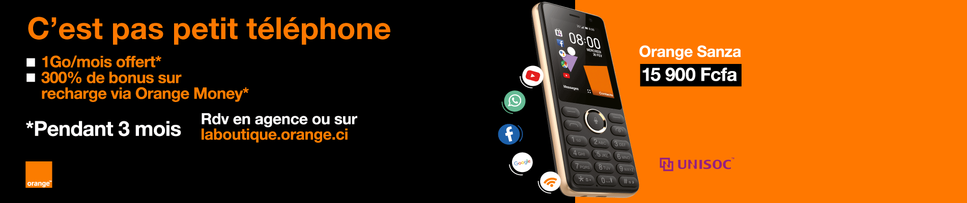 - Pour 15 900F je profite d’un Sanza + 1Go/mois pendant 3mois + 15 min d'appel vers les numéros Orange à l’activation + 100 SMS vers Orange à l’activation + 1 puce Novamix offerts